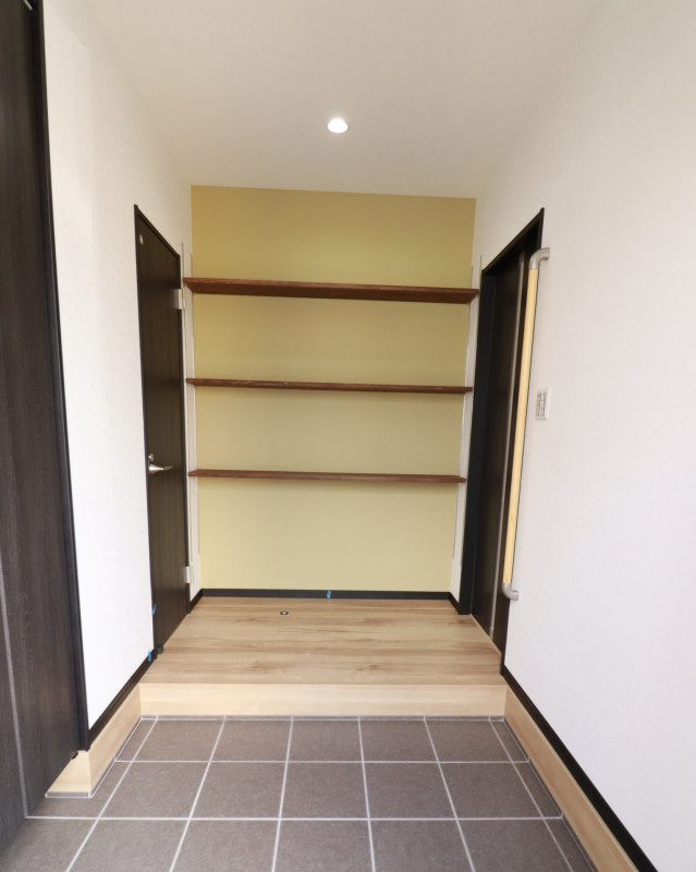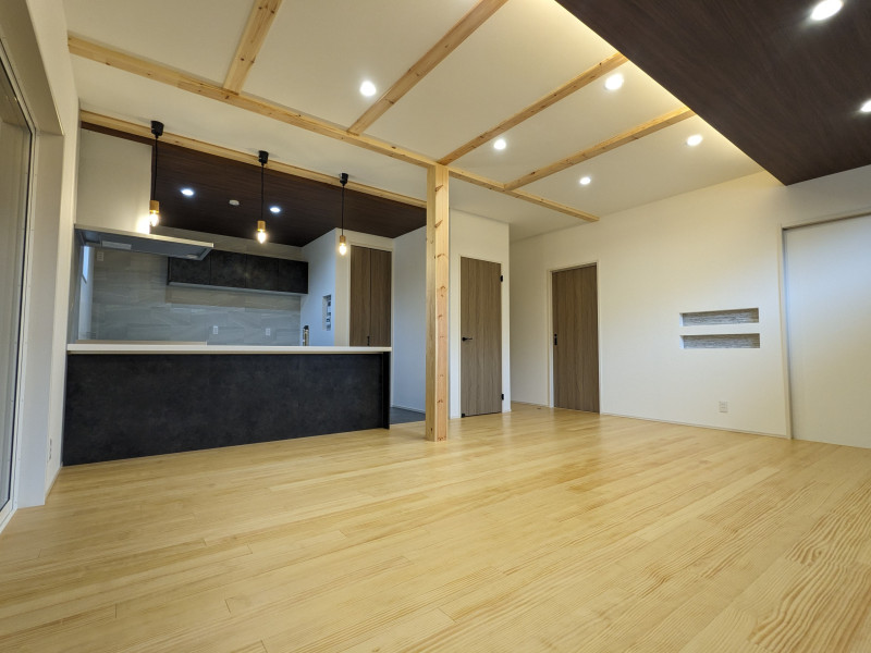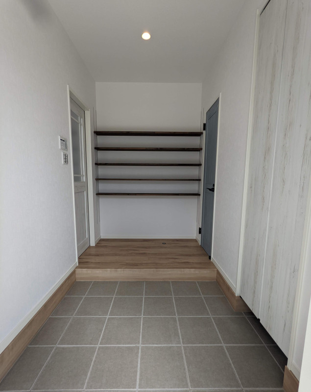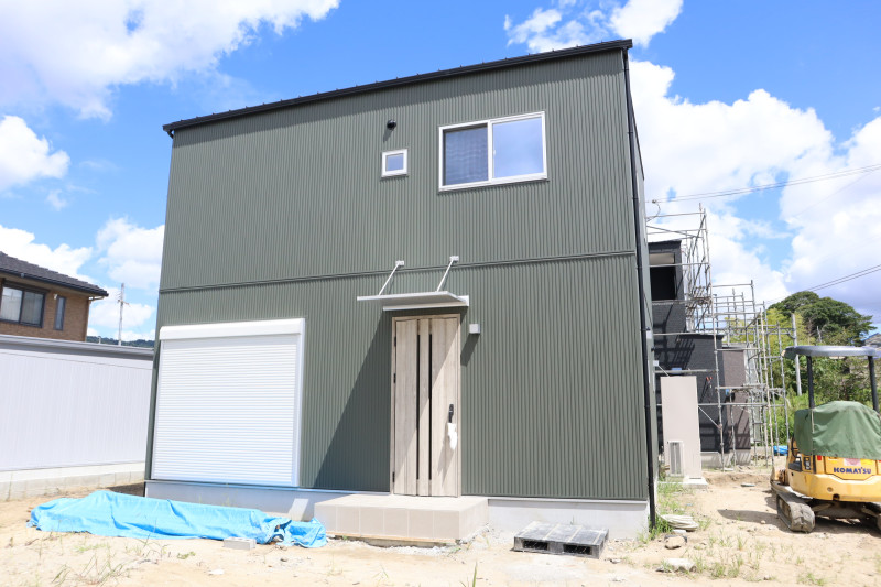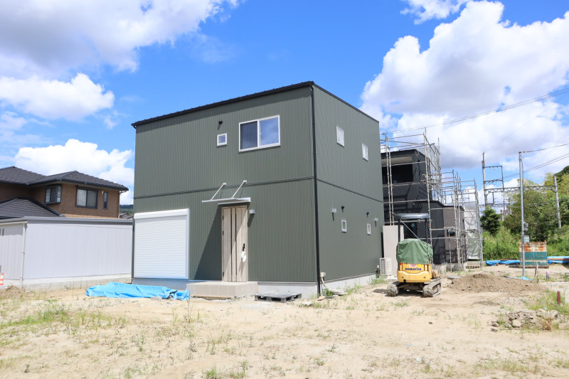 直線的なフォルムにグレーの外壁が映える、洗練された佇まい。玄関まわりは広く壁に覆われ、雨の日も安心して出入りできる設計。キューブをベースにしながら、暮らしやすさをしっかり考えた住まいです。シンプルなのに、ちゃんと気が利いてる──そんな毎日がここから始まります。