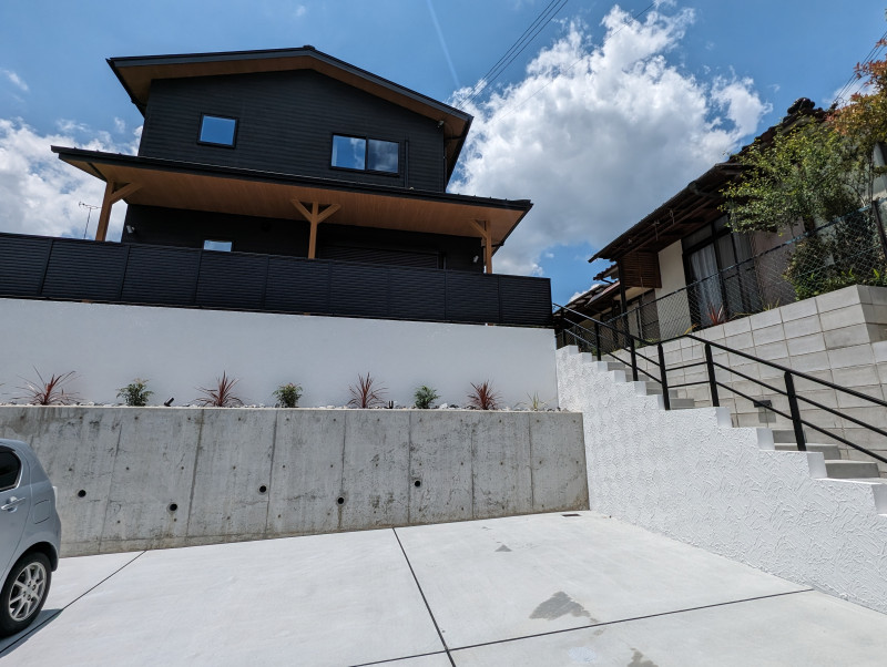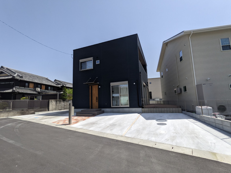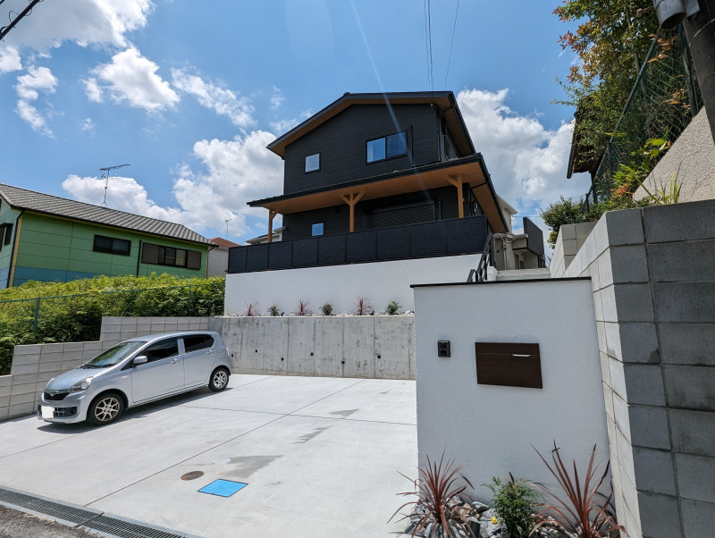 高台に佇む漆黒の外観と温もりある木目が調和した邸宅。広々とした駐車スペースと眺望を活かした設計で、都会的な洗練と自然のやすらぎを兼ね備えた上質な住まいです。