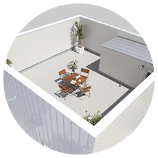 屋上へ続く階段を昇ると、そこにはワンフロア分の広々バルコニー。周囲の視線が気にならない開放感あふれるプライベートゾーンになり、空を感じながら、ガーデニングスペースとしても楽しめ、その魅力は無限大。