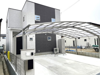 グレーを基調とした清潔感のある外観。リビング階段で開放感があり、収納スペースが充実した素敵なお家です。