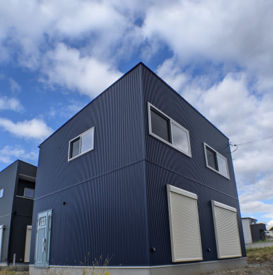 ネイビーの外観が静かに映える、端正なキューブ型の住まい。 LDKは打ちっぱなし風×レンガ調のクロスで空間に個性を宿し、壁一面の収納が大胆に暮らしを支える。 アイランドキッチンや二面採光の洋室など、使いやすさとデザイン性が共存する設計。 細部に遊び心を効かせながら、全体は静かに整った、余韻の残る一棟です。
