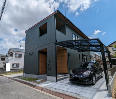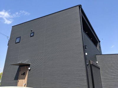 モノトーンで落ち着いた感じの外観。風がよくとおる設計になっています。各部屋に収納スペースがたくさん作られたこだわりのつまったステキなお家です