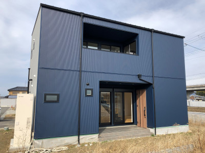 部屋の随所にルーフホームらしさが全面に詰まった「こだわりのSOLIDハウス」が完成しました!SOLID(無垢)感にこだわった内観、一際目を引く青の外観が特徴的です。シルバーのコートラインが青の外観に映えます。