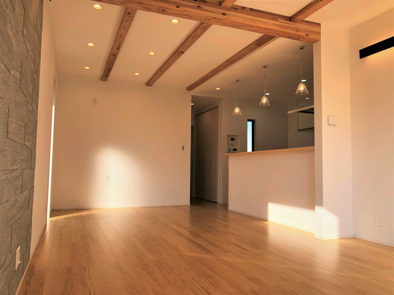 20帖の広々としたLDKに、無垢フローリングのやさしい質感が心地よく広がります。 ナチュラルな色調の壁と、天井に現れる梁が空間に奥行きと表情を添えるアクセントに。 素材の温もりと開放感が調和する、家族の時間を包み込む場所です。