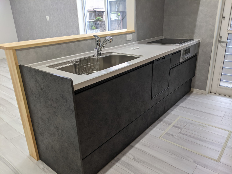 キッチンには、クリナップのKTシリーズを採用。ラスティチャコールの扉カラーが空間にほどよい重厚感を与え、白を基調としたLDKに美しいコントラストを描き出す。マットな質感と落ち着いた色味が、空間全体を引き締めながら、インテリアのアクセントとしても機能。
