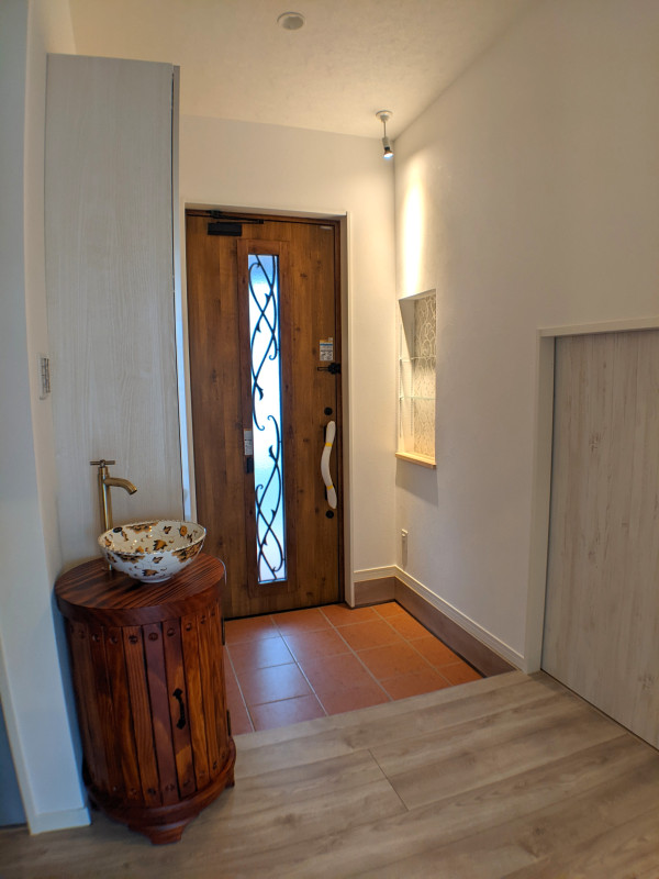 玄関まわりは素材の質感が際立ち、落ち着きと温もりを感じる空間に。 ホールには手洗い器が設けられ、使い勝手と衛生面への配慮が光ります。 玄関横のニッチが、さりげない彩りと個性を添えるアクセントになっています。