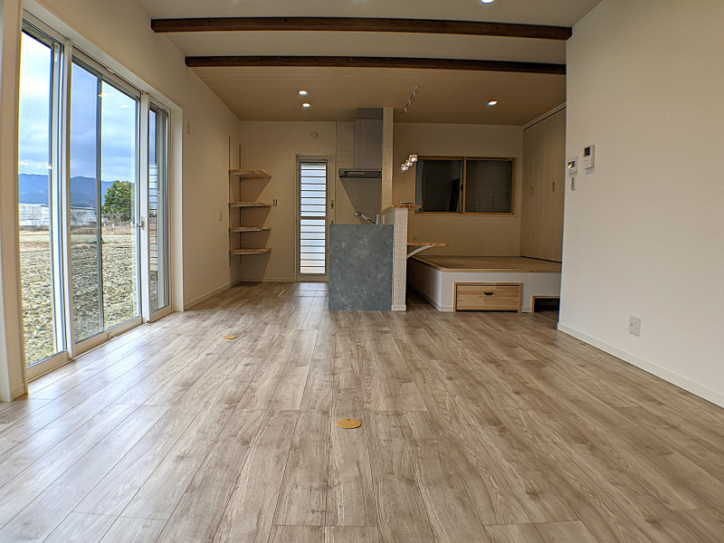 広々としたLDKの中に畳スペースが設けられ、空間にやさしい変化が生まれます。 穏やかな色調が光を柔らかく受け止め、落ち着いた雰囲気に包まれた居心地の良さ。 アクセントがほどよく効き、暮らしの中に静かな彩りを添えています。