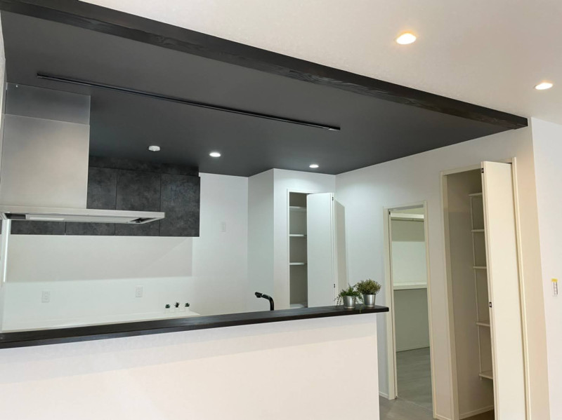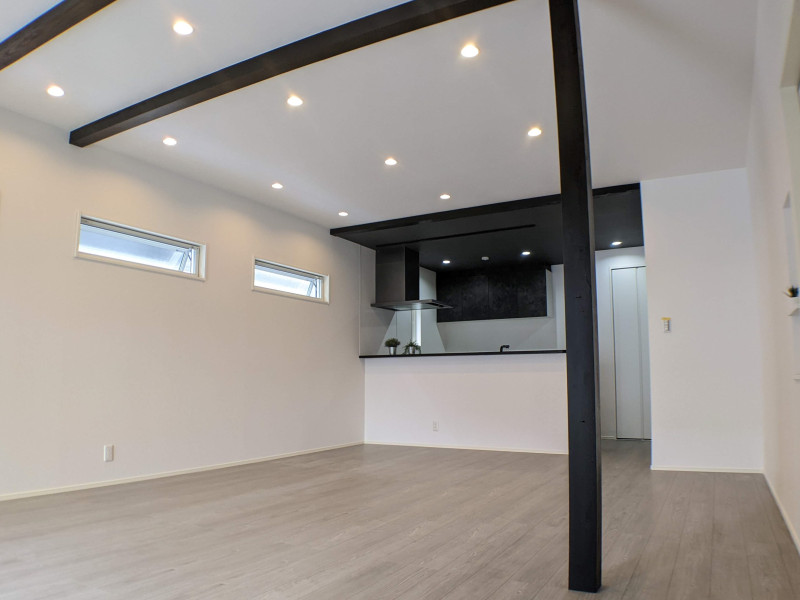 23帖のゆったりとしたLDKに、黒の梁が天井を引き締めるアクセントに。 ダウンライトの光が、白いクロスにやわらかく広がり、空間に心地よい陰影を生み出します。 シンプルながら奥行きを感じる、上質なリビング空間です。