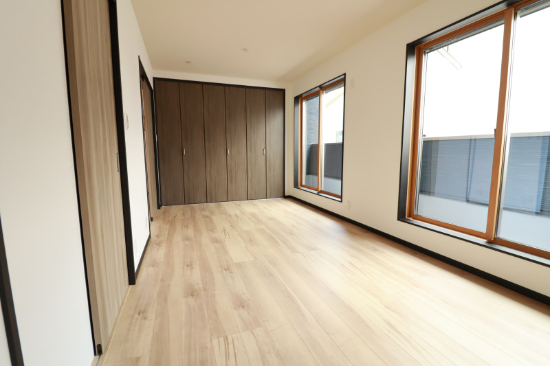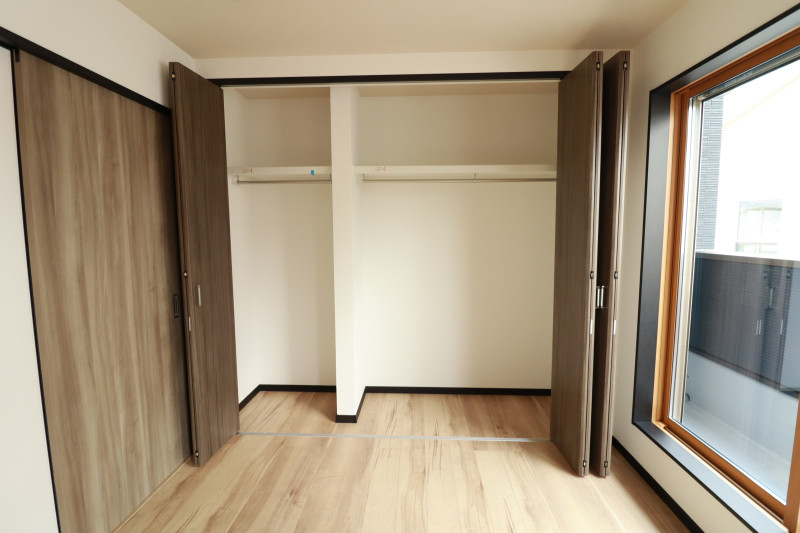 ナチュラルな木目調のクローゼットを設置。自然素材のような風合いが空間にあたたかみを添え、インテリアにもやさしく馴染みます。収納力もたっぷりで、衣類や季節物もすっきり整理可能。ベッドやチェストを置いても余裕のある広さで、家具の配置も自由自在です。