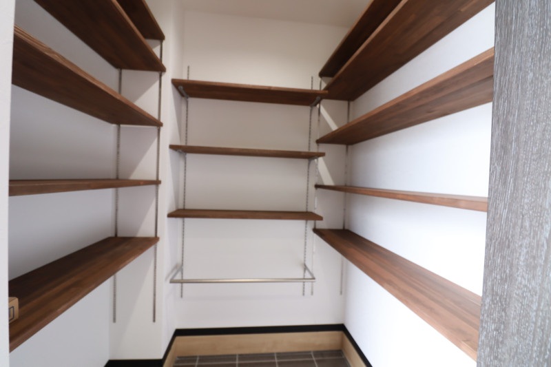 玄関を開けると、正面にすっきりと並ぶ可動棚が目に入る。靴や小物、季節の雑貨まで、暮らしに合わせて自由にレイアウトできる収納スペースが、日々の出入りをスマートにサポート。使いやすさと美しさを両立した、心地よい玄関空間です。