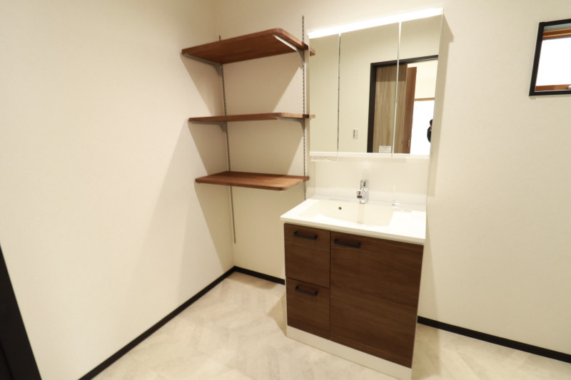 クリナップ「KTW」洗面台を採用した清潔感ある洗面室。横には3段の可動棚があり、タオルや洗剤などをすっきり収納。暮らしに合わせて使いやすく整えられる空間です。