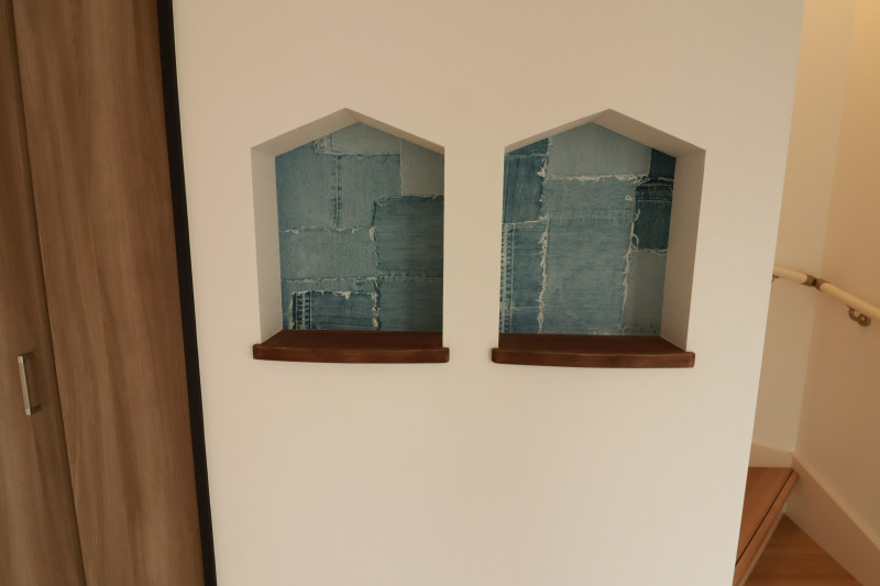 壁の一角に設けたニッチには、デニム調のクロスを採用。ほどよいラフさと素材感がアクセントとなり、空間に遊び心と個性をプラス。小物を飾るだけで、ぐっと雰囲気のあるコーナーに仕上がります。