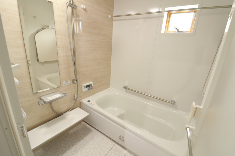 白を基調とした明るく清潔感のあるバスルーム。やわらかな「ほっカラリ床」で足元は快適、断熱性も高く冬でもあたたか。ゆるリラ浴槽で、毎日の入浴がリラックスタイムに。機能性と心地よさを兼ね備えた、上質な一室です。