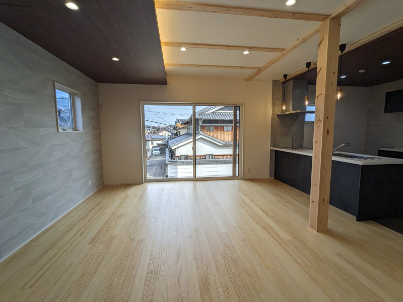 20.7帖のゆとりあるLDK。天井に伸びる木梁とやわらかなフローリングが上質な温もりを演出し、広い窓から差し込む自然光が一日中明るく開放的な空間を生み出します。