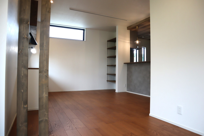 広々としたLDKは、統一感のある内装で心地よい空間に。 天井と壁はやわらかな雰囲気でまとめ、キッチンまわりにはさりげないアクセントをプラス。 造作棚やワークスペースを設け、暮らしやすさと程よい表情を両立させています。