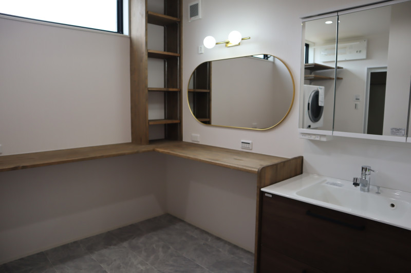 クリナップBCTの洗面台を設置した脱衣室。 バーントウォールナットの落ち着いたトーンでまとめ、隣の棚や大きな鏡を活かして、ボウルを使わずにできる支度もスムーズに行える空間です。