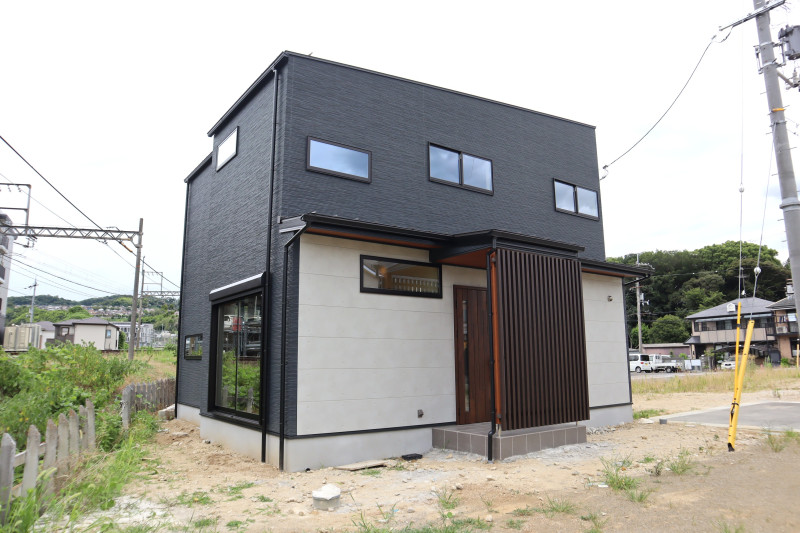 キューブ型の整った形が美しい外観。 落ち着いた外壁に、素材の風合いを生かしたアクセントを合わせ、静かにまとまりのある印象に仕上げました。
