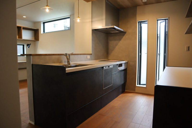 落ち着いたトーンのクリナップKT I型キッチン。 カップボードも同じ仕様で揃え、統一感のあるすっきりとした空間に仕上げました。