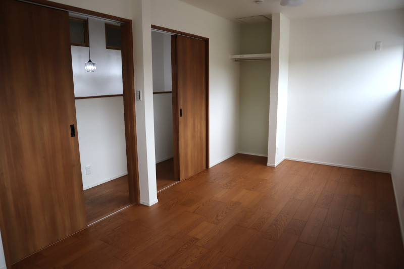 落ち着いたクロスでまとめた洋室。 将来的には間仕切りで2つの子ども部屋としても使え、成長に合わせて変化する暮らしを柔軟に受け止める空間です。